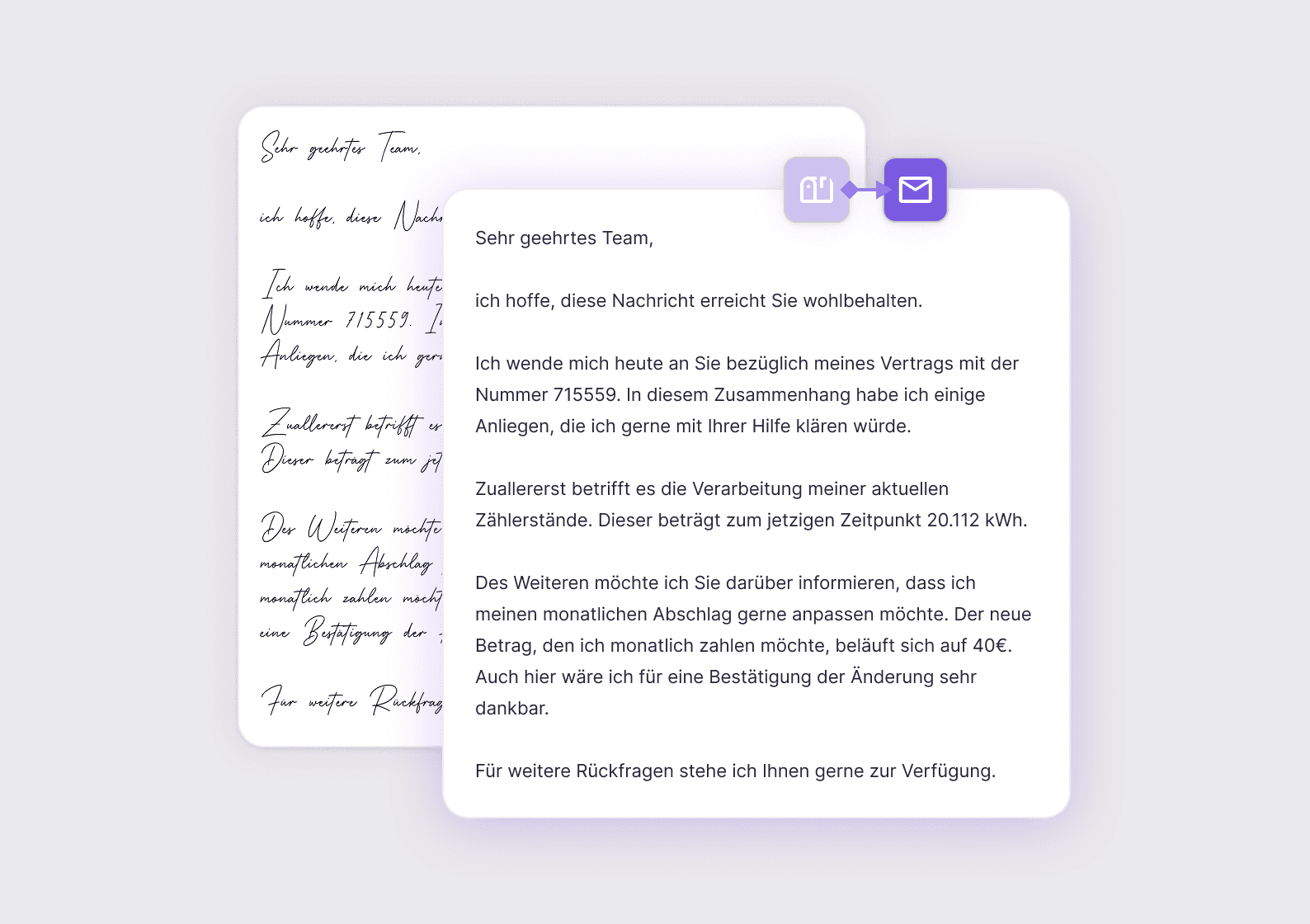 Eingehende Briefe werden automatisch erkannt, ausgelesen und in strukturierte digitale Vorgänge überführt. Inhalte stehen sofort im System zur Weiterverarbeitung bereit und können direkt in bestehende Serviceprozesse integriert werden.