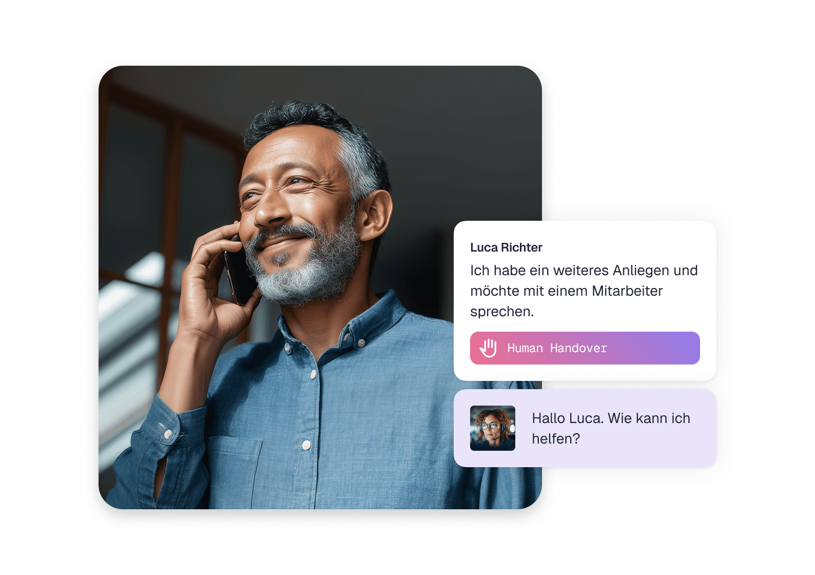 Auf Wunsch des Kunden oder bei komplexen Anliegen erfolgt die Übergabe an einen menschlichen Agenten. Gesprächsverlauf, Transkript und Kundendaten werden vollständig übergeben und ermöglichen eine nahtlose Fortsetzung ohne Wiederholungen.