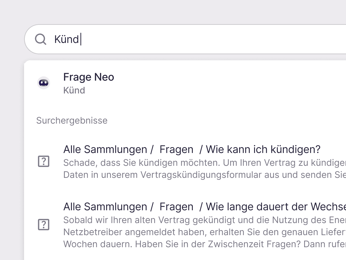 Die Wiki bietet über die personalisierten KI-generierten Antworten hinaus eine klassische Suche und direkte Ansteuerung relevanter Artikel an. Sie schlägt relevante Artikel bereits während der Eingabe vor, sodass Agenten sofort den passenden Artikel auswählen und auch unter Zeitdruck schnelle und präzise Unterstützung erhalten.